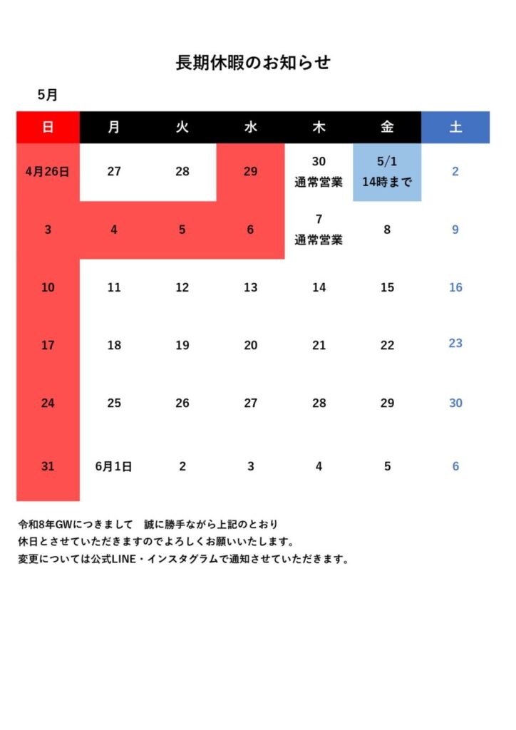 さて、GWの休業予定日が決まりましたのでお知らせいたします。
